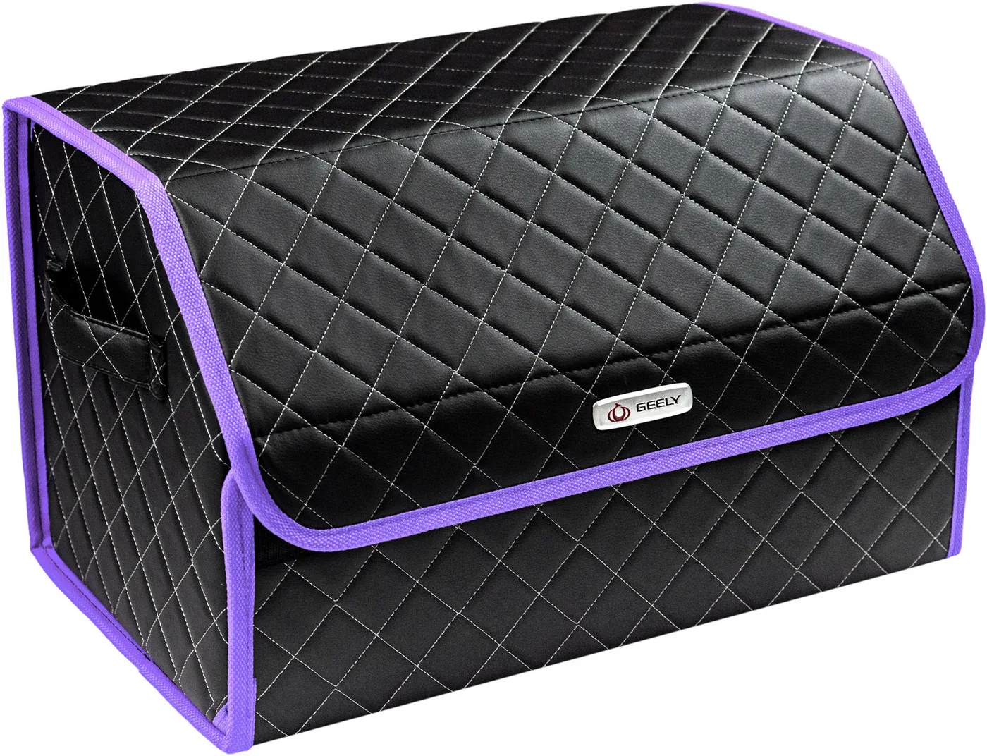 Special Offer Сумка-органайзер в багажник автомобиля из экокожи черная с серой нитью ViceCar (фиолетовый кант) с логотипом GEELY Discount [NEW!!] Today!